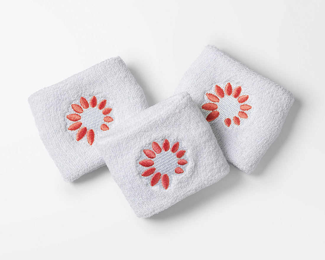 Soft and stretchy sweatband in terry cloth. Embroidered with Daisy Cuts flower in a lovely coral red color that matches most of our sports skirts. Absorbs sweat and keeps you dry during training. Height approx. 6.5 cm.